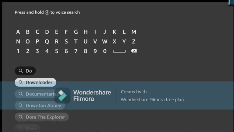 2) Type in the initial letters of ‘Downloader’ in the search bar, then use the arrow keys and the Enter button on your remote to select the matching result.